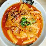 A popular Korean dish of chewy rice cake in a sweet and spicy sauce with fish cake.