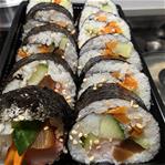 A popular Korean dish of cooked rice and a variety of other ingredients rolled in a sheet of dried seaweed